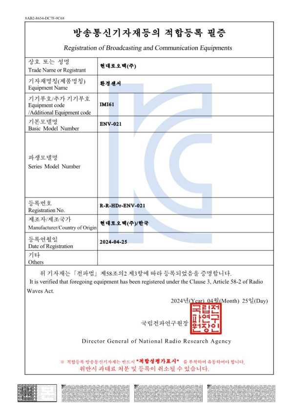 ENV-021 환경센서_방송통신기자재등의 적합등록필증